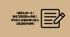 【運営レポート】雑記ブログ6ヶ月目!PV数と収益の振り返り【2025年8月】 こんにちは、みーです。記録的な猛暑だった夏も、ようやく終わりが見えてきましたね。皆さんはどんな夏を過ごされましたか? 私はというと、軽い熱中症を経験しながらも...